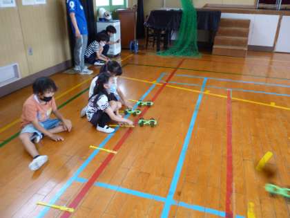 3年生は理科でゴムの力について学習しています。ゴムの反動で走る模型の車を使って実験していきました。ゴムを長く引っ張ると車のスピードや走る距離がどのように変わるかを確かめていきました。