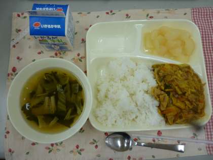 6月14日の給食は「和風カレー丼」「すまし汁」でデザートに缶詰の和梨がでました。人気のカレーと丼なので子どもたちは大喜びでした。