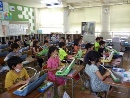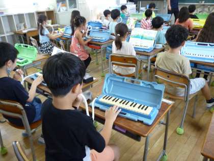 2年生は鍵盤ハーモニカの演奏に取り組んでいます。音符を見ながら指を動かすのはなかなか難しいです。