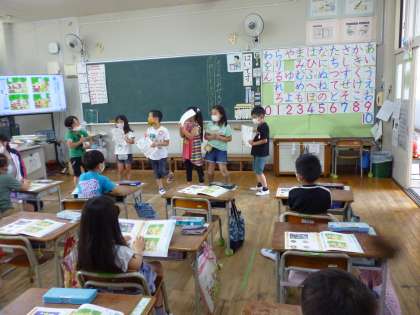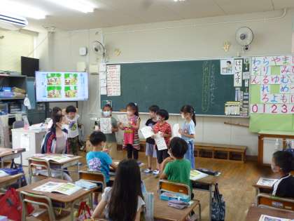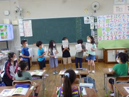 1年生は道徳で動物たちが登場するお話を学習しました。わけへだてなく友達と接していこうというテーマで、1年生はお話に登場する動物になりきって劇をしながら学習していきました。