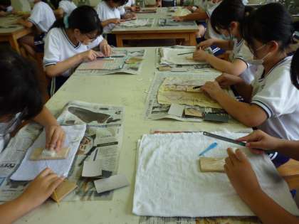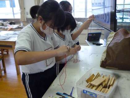 6年生は近つ飛鳥博物館の職員の方から勾玉作りを教えていただきました。勾玉用の石を小型ののこぎりで削り、紙やすりで角をとって丸く仕上げていきました。最後は首にかけるひもを通して完成です。社会科と図工のよい学習になりました。