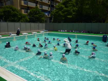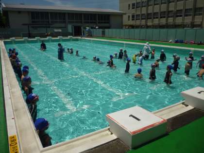 今日からプール水泳が始まりました。今日は1,2年生と5,6年生がプールに入りました。近畿地区は早くも今日、梅雨明けし、気温も水温もプールに入るには絶好の条件で、1年ぶりのプールに子どもたちの歓声が響いていました。