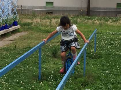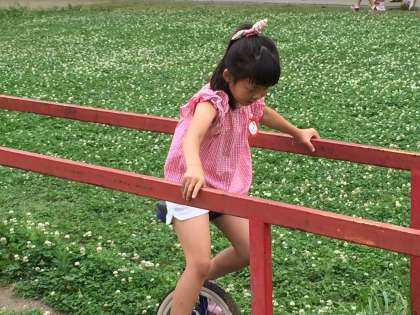 芝生ひろばは、一輪車の練習に1年生がよく使っています。ころんでも、すりむくことがないので思い切って乗っています。