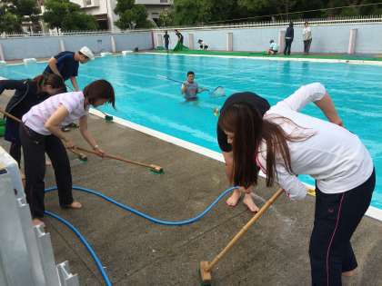 プール開きは、25日、26日を予定しています。プールはすでにきれいに掃除していますが、直前にも全職員で点検をかねて掃除をします。
