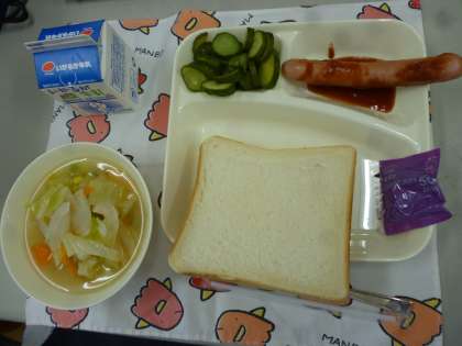 6月最終の給食は「ウインナーのケチャップソース」「スープ」「きゅうりのサラダ」です。ウインナーはケチャップ味がとても効いていました。