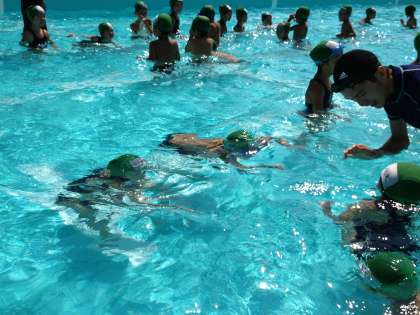 1年生では、はじめのころ、大きなプールがこわい子もいました。2年生に助けてもらいながらのプール水泳でした。ひと夏がすぎて、まもなくプール納めです。練習の成果を評価する時期になりました。先生が水の中でグー・チョキ・パーを出しているのをもぐってあてること、ビート板をもってまっすぐに浮かぶことが内容です。みんな顔を水につけることができるようになりました。