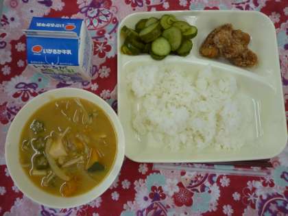 7月5日の給食は「豚肉のたつたあげ」「みそ汁」「きゅうりの甘酢づけ」です。たつたあげは大人気の献立です。