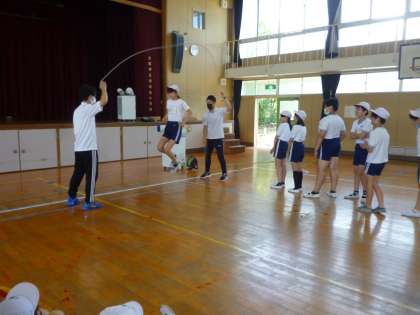 6年生は大阪市経済戦略局の施策で長縄跳びを教えてもらいました。「ダブルダッチ」といって2本の縄跳びを同時に交差するように回していく長縄跳びです。長縄跳びの跳ぶリズムが倍になるので難しいのですが、こつをつかみ、上手に跳んでいきました。