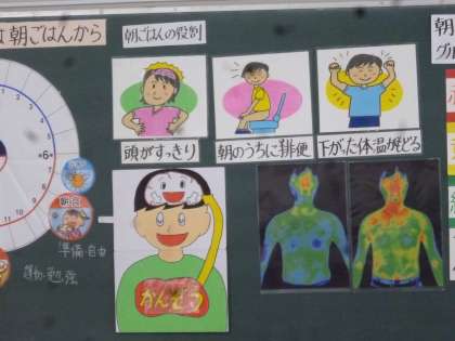 5年生は他校の栄養教諭の先生に栄養についての授業をしてもらいました。テーマは「1日のスタートは朝ごはんから」」です。朝ごはんを食べることにより頭がすっきりして学習に集中できることなど、朝ごはんの大切さについて教えていただきました。これからもしっかり朝ご飯を食べていってほしいと願っています。