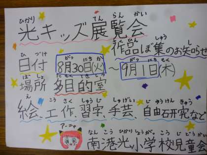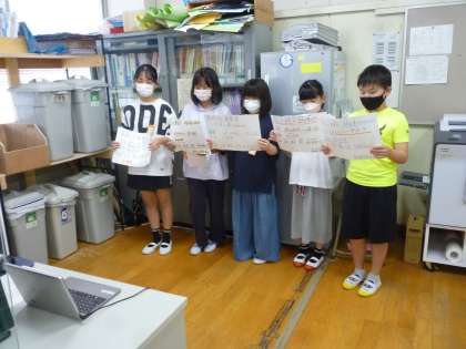 今日の児童朝会で学級代表委員(4年生以上)が「光キッズ展覧会」(夏休みに作った工作や絵、その他自由勉強の作品を展示する展覧会です)の作品募集のアピールをしました。自分たちで作成したポスターを掲げて作品を作るようお願いしていました。オンラインの画面で各学級に気持ちを届けていました。