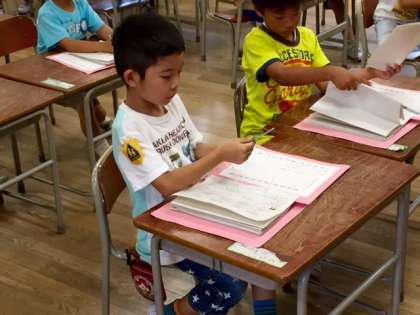一年生はテストを返してもらい、キチンとファイルに綴じていました。かわいいシールが貼ってある答案用紙を大切に扱っていました。