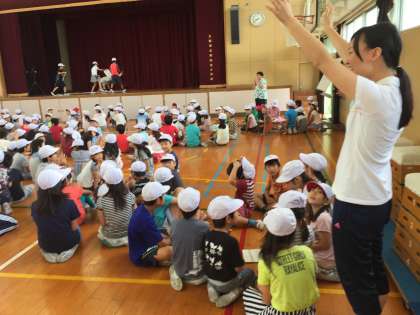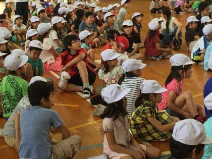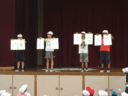 児童集会では、文字あてクイズをしました。先生の名前をバラバラにならべて、どの先生かを当てるクイズです。たてわり班ごとに相談して、答えを紙に書いていました。