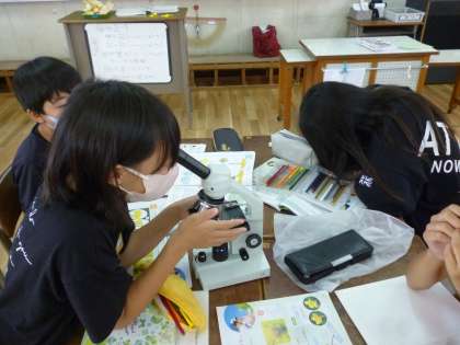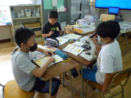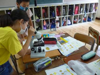 5年生は理科の学習で、顕微鏡を使ってヘチマの花粉を見ました。畑で花粉を採り、顕微鏡を調整しながら花粉を見ました。ピント合わせに苦労していましたが、きれいに花粉が見えてしっかり観察していました。