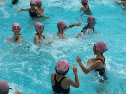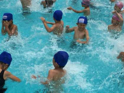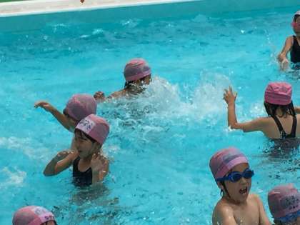水が顔にかかっても平気です。友だち同士での水のかけあいでは、みんな大興奮でした。