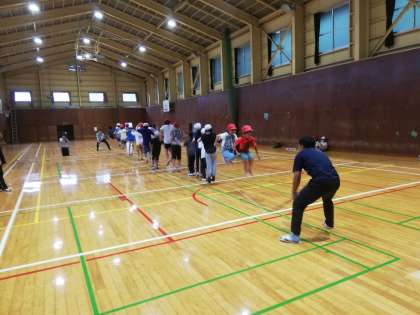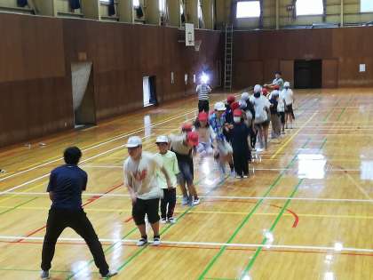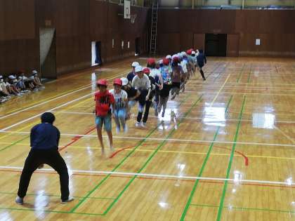 次は大縄跳びです。クラス全員が大縄をタイミングを合わせて跳びます。とても難しいですが、1組も2組も1回クリアしました。