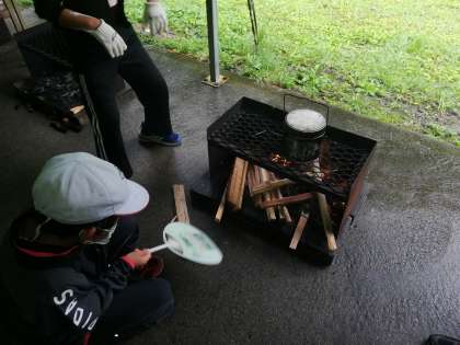 かまどに火をつけています。なかなか火がつかず、苦労しています。