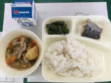 ごはん、牛乳、さごしの塩焼き、豚肉とじゃがいもの煮物、オクラのいためものです。じゃがいもがほくほくしていてあまがらくておいしいです。オクラもあま口でトロっとしていておいしいです。