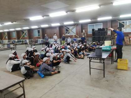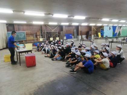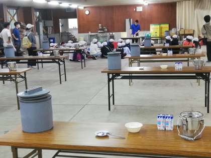 アイスクリーム作りを始めました。説明をしっかり聞いています。建物の外は激しい雨です。