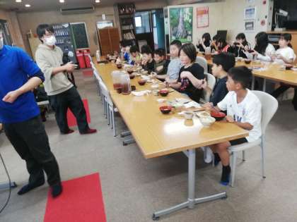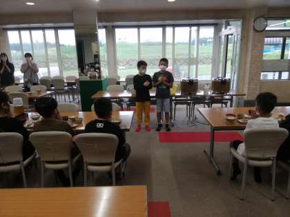 いよいよ昼食です。林間学習最後の「いただきます」になります。かやくご飯は大人気でおかわりをする子がいっぱいです。