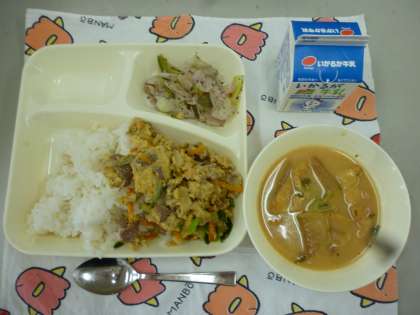 9月7日の給食は「他人丼」「とうがんのみそ汁」「キャベツの赤じそあえ」です。丼はどの種類でも子どもたちに人気です。