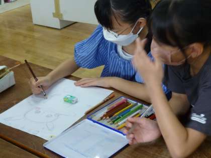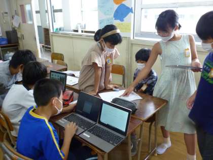 5年生は住吉大社からいただいた稲を育ててきました。順調に育っており、稲穂が重さで垂れ下がりかけています。その稲を鳥から守るため5年生は案山子を作り始めました。今日はどんな案山子を作るか、グループで話し合い、設計の絵を描いていきました。なお、できた案山子は校内に飾った後、住吉大社の御田に移されます。