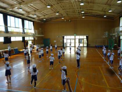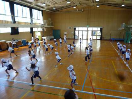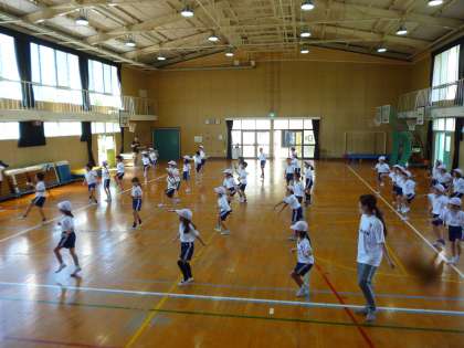 1年生と2年生は運動会に向けてダンスの練習を始めました。まずは踊りを覚える必要があるので、一つ一つの動きを教えてもらい、実際に踊っていきました。