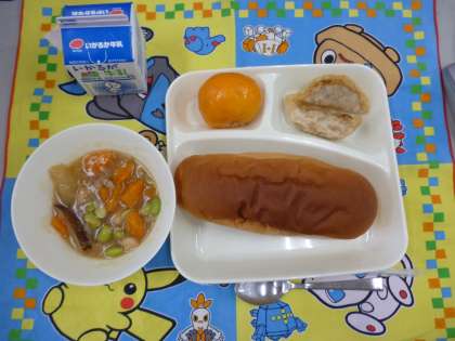 9月13日の給食は「あげぎょうざ」「鶏肉ととうがんの中華煮」「冷凍みかん」でした。給食ではみそ汁や煮物にとうがんが出てきます。とろっと柔らかい食感がよい野菜です。あげぎょうざは子どもたちの好きなおかずの一つです。