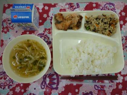 9月14日の給食は「さけのつけ焼き」「五目汁」「高野豆腐のいり煮」でした。さけのつけ焼きはしょうゆ味でご飯のおかずにぴったり、大きさも食べやすかったです。高野豆腐のいり煮はひじきも入ってヘルシーなおかずでした。