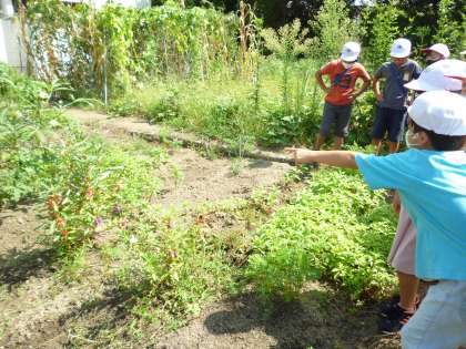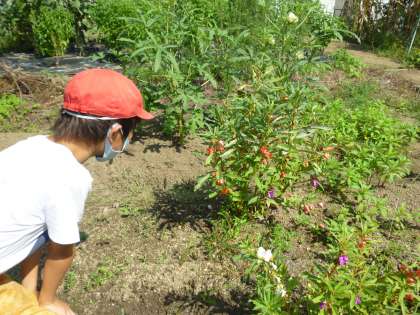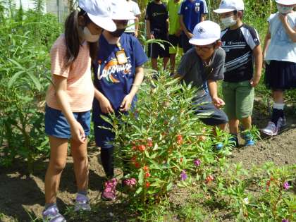 3年生の理科の学習で、春、畑にホウセンカを植えました。大きくぐんぐん育ち、きれいに花を咲かせたホウセンカの花や実を観察に行きました。実の形や様々な色のホウセンカの花をしっかり観察したり、手で実の感触を確かめたりできました。