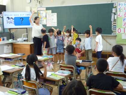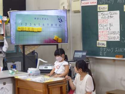 今年度も本校では、算数科を研究教科として学力向上に取り組んでいます。今日は今年度最初の研究授業と研究討議会が行われました。授業の内容は、算数科でたし算やひき算の学習をすすめている1年生が「3つの数の計算」に取り組む学習でした。たくさんの先生方が授業を見に来ましたが、1年生は緊張せず、しっかり考えたり、意見を発表したりできました。