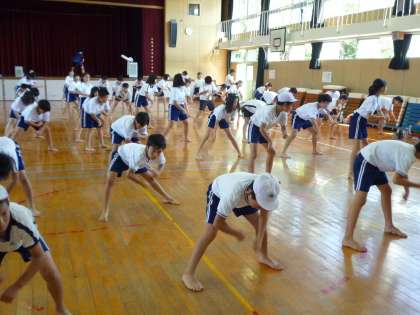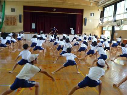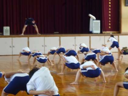 南中ソーランの踊りは、まさに筋トレ。腰を低く落として、中腰で踊ったり、膝を折って、屈伸の姿勢から立ったりしゃがんだりを繰り返します。しんどいはずなのですが、子どもたちは、とてもやる気を持って、楽しんで踊っています。子どもたちのやる気が伝わり、先生たちもさらに指導に熱が入ります。まだ、踊りだして日が浅いのですが、ほとんどの子どもたちが振りを覚えていて素晴らしいです。