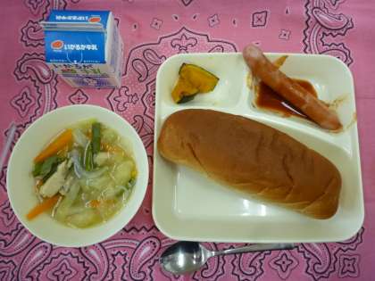 9月20日の給食は「ウインナーのケチャップソース」「スープ」「焼きかぼちゃ」です。ウインナーは大人気献立です。ケチャップの味がよく合っていました。