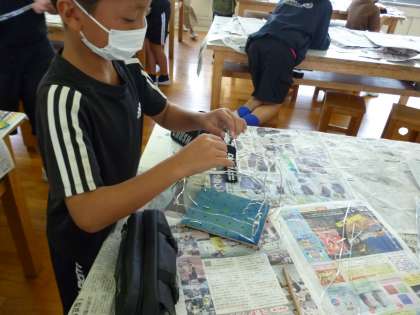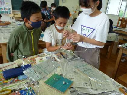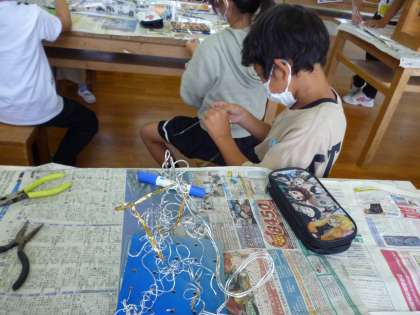5年生は針金を使ってタワーを作りました。ペンチで針金を曲げたり、つなげたりしながら思い思いのタワーを完成させていました。