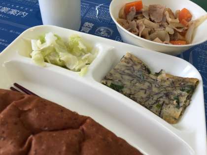 今日の給食にはヒラヤーチーがでました。「平焼き」のことを沖縄では「ヒラヤーチー」と読みます。小麦粉、卵、水といろいろな具材を混ぜ合わせた生地を平らに焼き上げます。今日のものは、沖縄らしくもずくが入っていました。韓国のチヂミによく似ています。