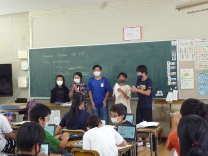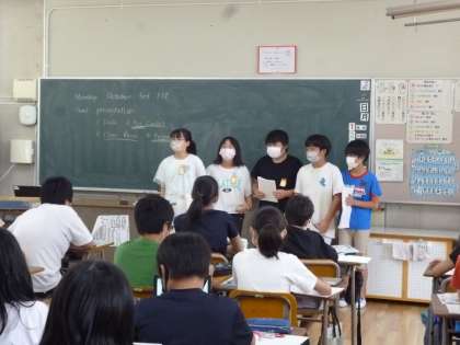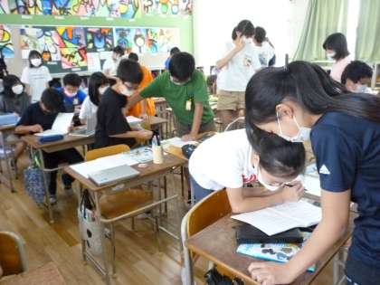 6年生は夏休みの思い出を英語で話す学習をしています。「Smile」「Clear Voice」など、目標を決めてスピーチしていきました。発表後は思い出を書いたノートをみんなで確認しあいました。