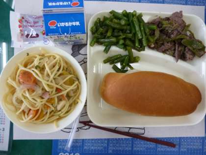 10月6日の給食は「牛肉の香味焼き」「ホタテ貝とトマトのスープスパゲッティ」「さんどまめ」のサラダです。スープスパゲッティはホタテ貝がたくさん入っていてぜいたくな献立でした。