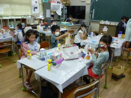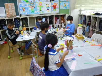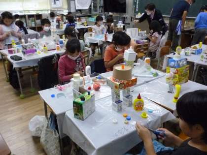 3年生は工作でロボットを作っています。空き箱や紙皿など家庭の廃材を使って作成していきました。胴体ができてきたので腕を作っていました。どの作品も形が違っていて完成が楽しみです。