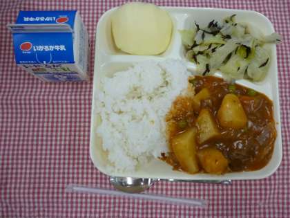 10月7日の給食は「ハヤシライス」「キャベツのひじきドレッシング」で、デザートにりんごがでました。大人気の「ハヤシライス」はルーに米粉を使っており、小麦アレルギーに配慮した献立です。