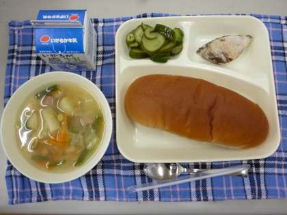 10月11日の給食は「かつおのマリネ焼き」「ウインナーとじゃがいものスープ」「きゅうりのサラダ」です。「かつおのマリネ焼き」はノンエッグドレッシングで、卵アレルギーに配慮した献立です。