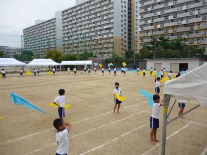 5年生、6年生はカラーの旗を持って踊ります。運動場に旗を振る音が響いていました。