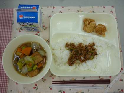 10月12日の給食は「鶏肉のから揚げ」「あつあげと野菜の煮物」「おかか菜っ葉」です。から揚げは人気上位の献立です。
