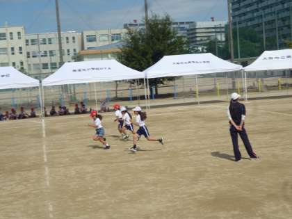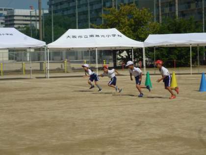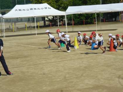 1年生と2年生は徒競走の練習をしました。正面から見て右から左へ直線を走ります。緊張した顔つきでスタート位置についていました。