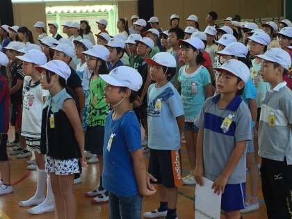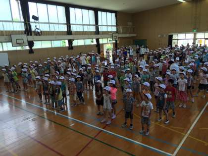 児童集会の後に終業式をしました。もし、明日が休校となった場合に備えて、一日早く実施しました。みんなで校歌をうたい、1学期をしめくくりました。