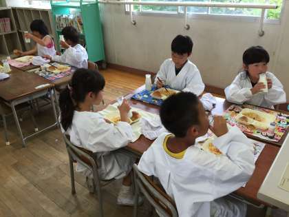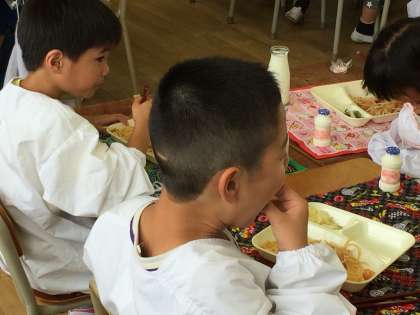入学した当初は6年生に給食を助けてもらっていた1年生ですが、もうりっぱに自分たちで準備をして、残さず食べることができるようになりました。
