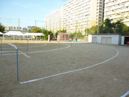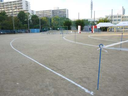 運動場の保護者観覧エリアは写真の手前の杭から奥の入退場門までです。本部テントを挟んで両側にあります。