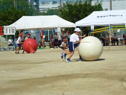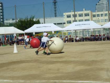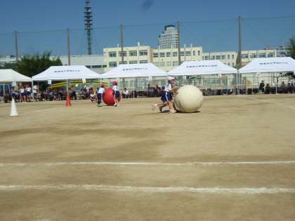 1年生、2年生の団体競技「大玉王にみんなでなる」(大玉ころがし)です。1年生、2年生が別々に競技します。低学年にとって大玉はとても大きく感じたことでしょう。