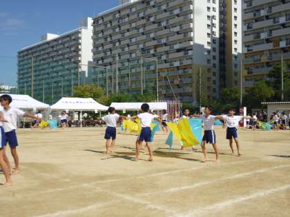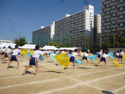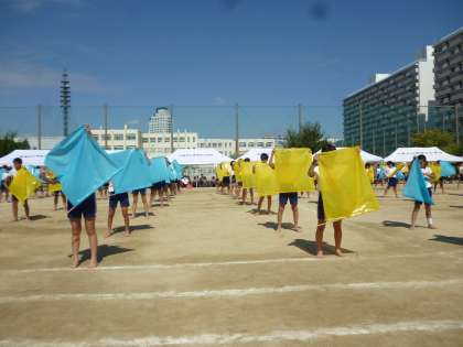 いよいよフィナーレです。5年生と6年生の「光ソーラン」です。まずはフラッグを使ったダンスです。フラッグが風を切る音が運動場に響き、フラッグを持っての隊形移動が見事でした。
