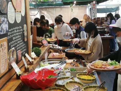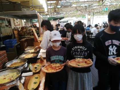 バイキングのメニューがいっぱいなので、みんな迷っています。