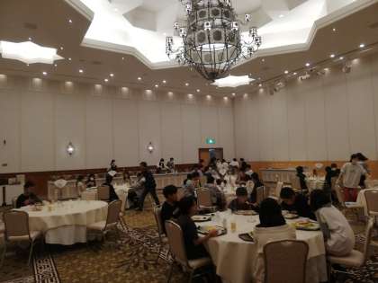 結婚式の披露宴で使われるシャンデリアのある豪華な会場です。