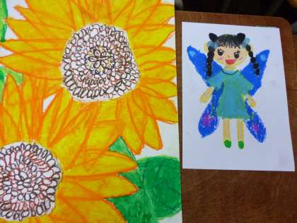 大きなひまわりを画用紙いっぱいに描いていました。今日は妖精を描きました。みんな思い思いのかわいい妖精ができあがりました。